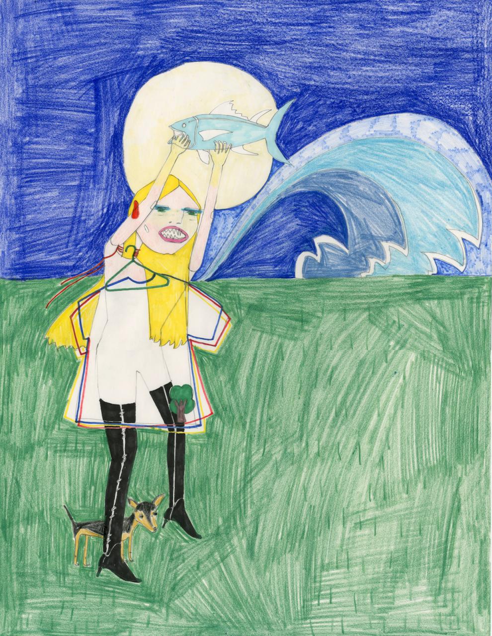 Graphically, I am inspired by works of artists such as David Hockney, Alex Katz, and Ellsworth Kelly. Each of them show a different way of portraying nature. Regarding the design process, I combined my personal graphical world with elements and pieces of clothing I am surrounded by. For the garments, I wanted to look for fragility and find a certain sense of patience within myself, taking the time to make something by hand. Some things you cannot rush, but in the end it will give you a piece of mind, and happiness. ‘How to catch a fish?’