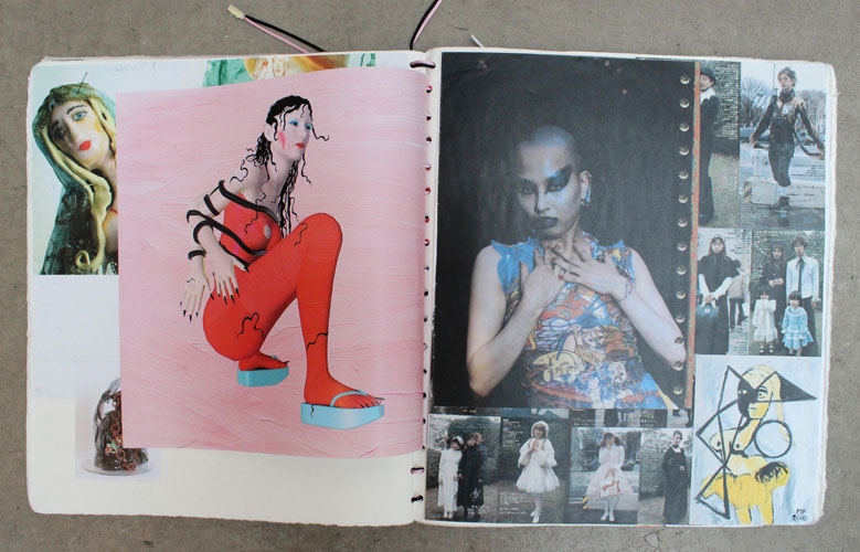 I never have this one inspiration that I base a collection or garment on. The influences keep coming in, there’s always something that inspires me and I keep going in different directions. In the beginning I was inspired by a Dutch artist called Marliz Frencken. The most interesting to me were her glass sculptures. The ones I was drawn to were depicting different girls in provocative ways. For instance, she put the Virgin Mary in a bra and covered her in diamonds and pearls. I was like: “Wow, she is crazy!” She also uses these pinks and greens and loud colours and as you can see by what I’m wearing, I’m really into that. But she also mixes all types of items and materials and it still looks super nice. So that made me want to use bold combinations. Like mixing more ‘erotic’ fabrics with old-fashioned ones.
